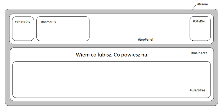 Sekcja #frame zawiera w sobie wszystkie elementy. Jej szerokość jest 10px mniejsza niż szerokość jaką daje nam okno iFrame Facebooka (760px). Wewnątrz mamy dwa większe kontenery - #topPanel i #mainArea. Pierwszy zawiera zdjęcie użytkownika, jego imię i nazwisko oraz miasto w którym aktualnie się znajduje. Drugi składa się ze stałego tekstu oraz pola #userLikes sformatowanego tak, by wyświetlał dane w trzech kolumnach.